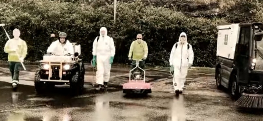 The accompanying video clip is equally violent in its imagery, with men dressed in chemical suits and masks, holding their ‘weapons of plant destruction’ as if they are Kalashnikovs – really this is Plymouth, not a Hollywood film-set!